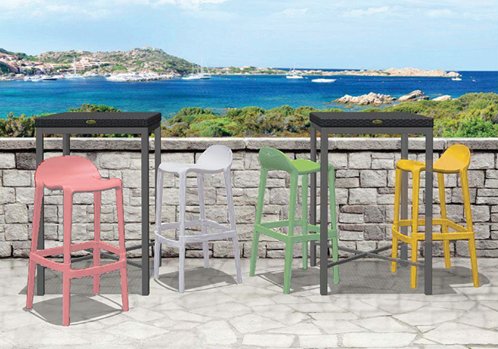 patas, asiento y respaldo: de dos piezas en polipropileno de alta resistencia y duración para intemperie, resistente a los rayos ultravioleta (UV) y al ambiente salino.