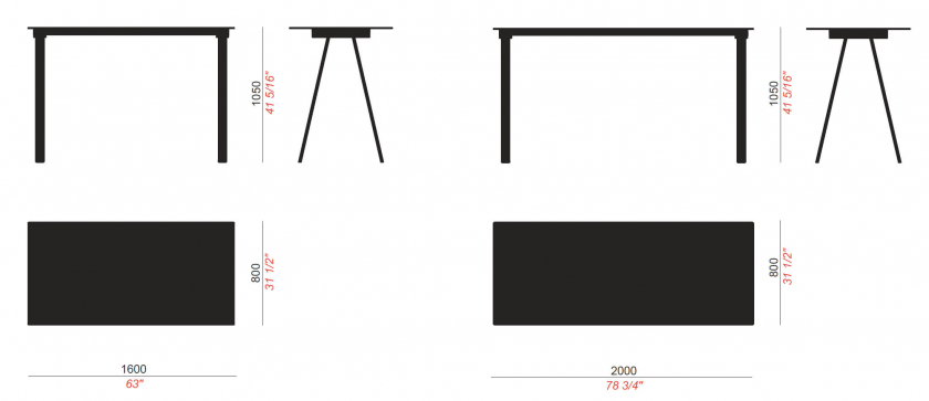 Las mesas VU deben su nombre a la conformación característica de su estructura, que dibuja una letra "V" invertida. En la versión con sobre cuadrado o redondo, las cuatro patas están dispuestas en forma radial y permiten el uso de sobres de hasta 130 cm de tamaño.