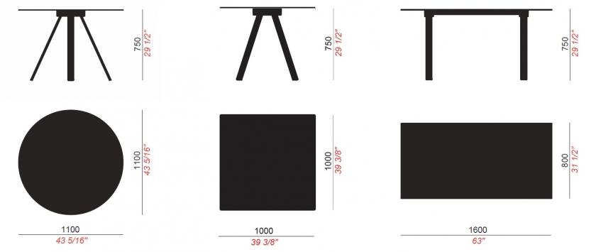 Esta gama de mesas para bares y restaurantes ofrece la posibilidad de elegir entre muchas variantes diferentes: con sobre cuadrado, redondo o rectangular, y con patas dispuestas en caballete en los dos lados o en forma radial en el centro.